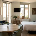 Tento apartmán má také parketovou podlahu. Některé pokoje umožňují výhled na město.